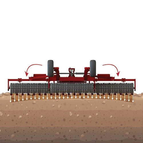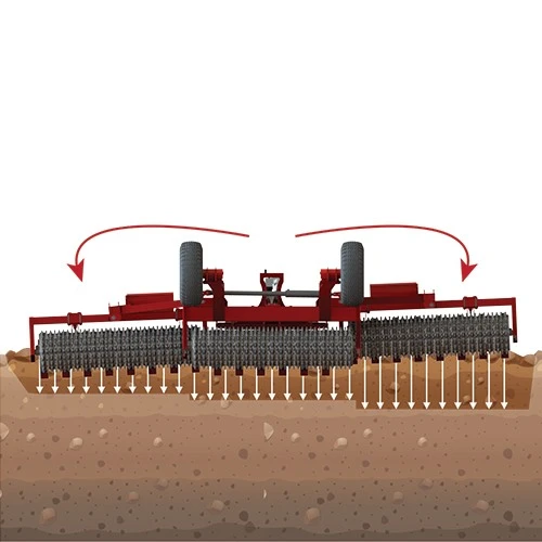Thanks to the individual moving functionality at each section, the machine ensures that the roller sections follow the field surface at the most rough surface conditions and ensures continuous contact of the volant and the gears of the roller with the soil.